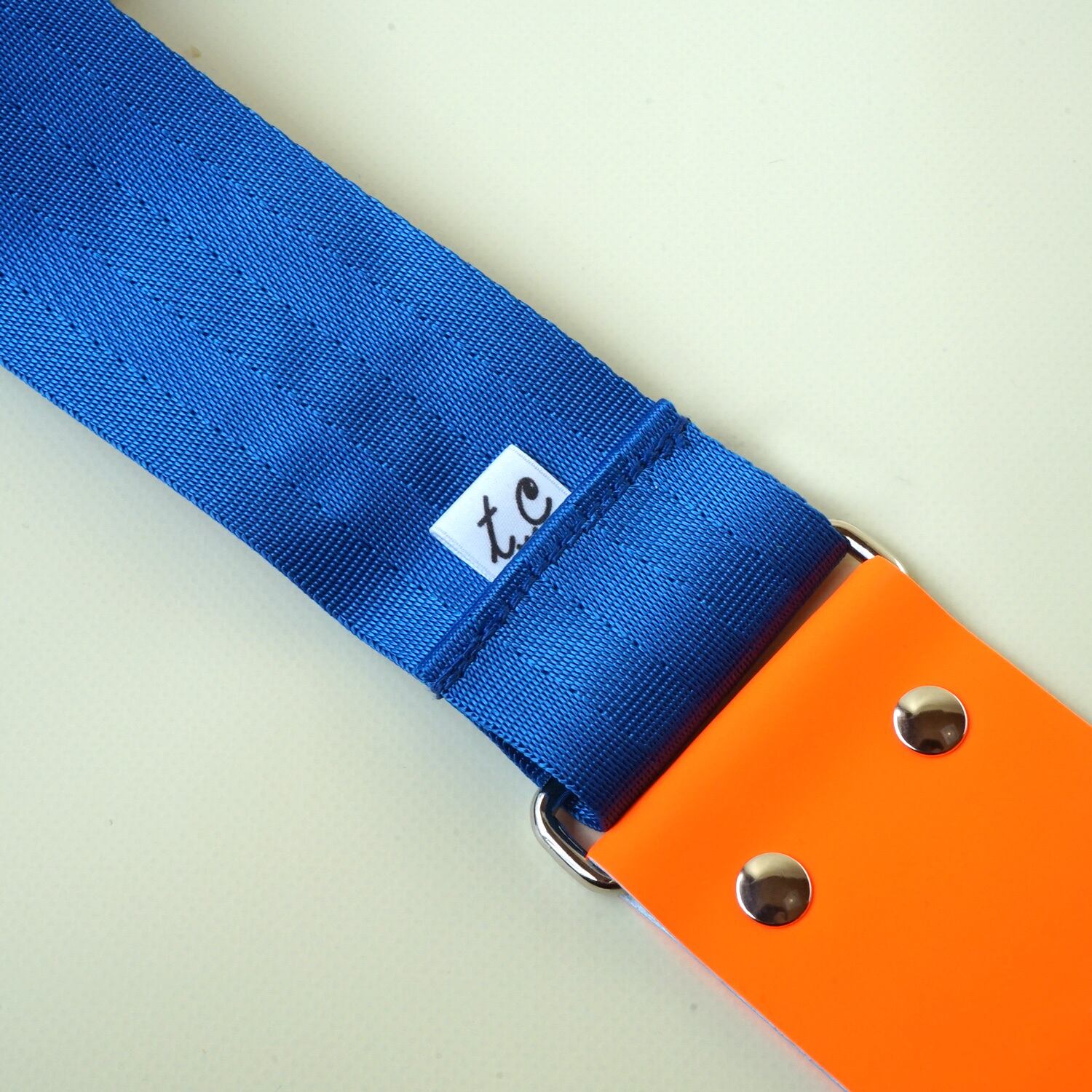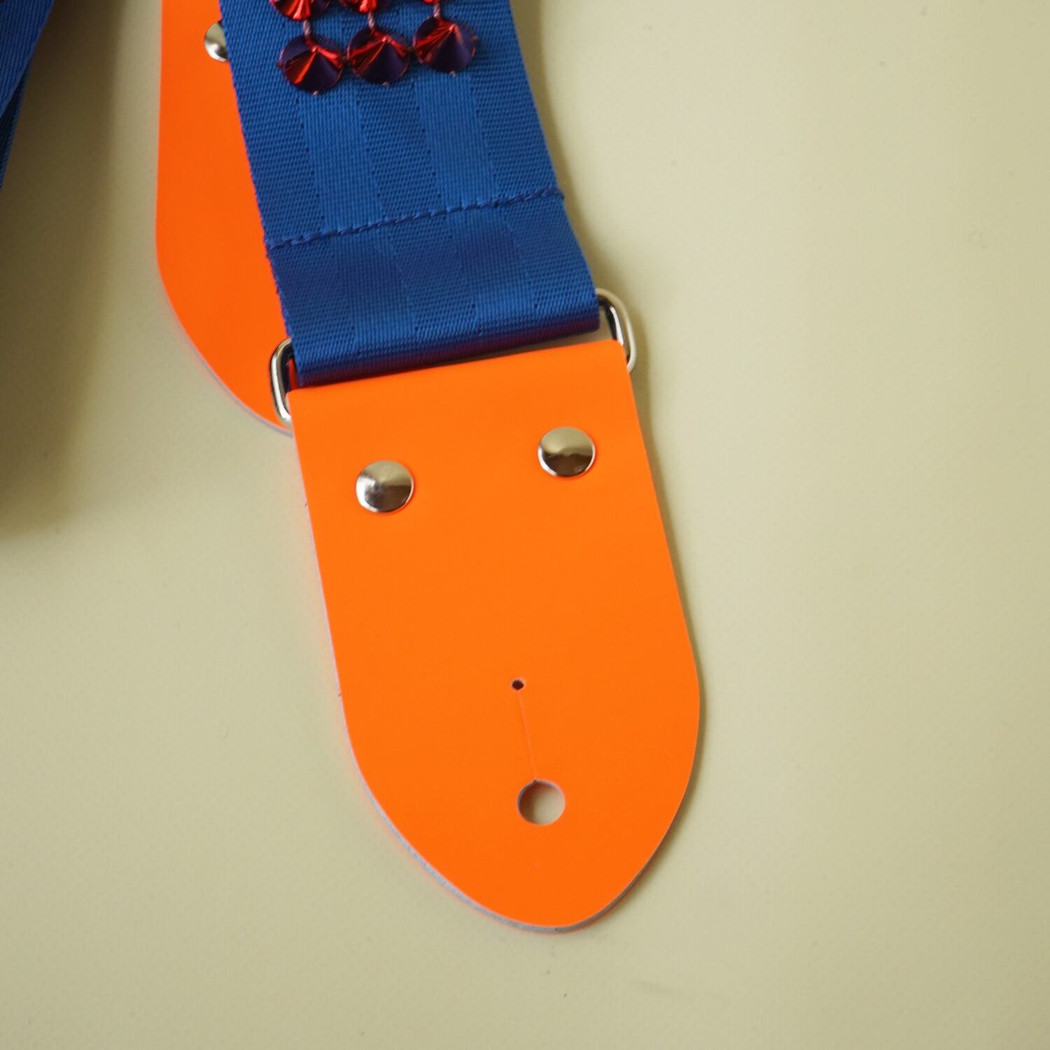 目の覚めるような鮮やかなネオンオレンジのレザーに恋してしまったので、誰もが唸るようなギターストラップを作りました。