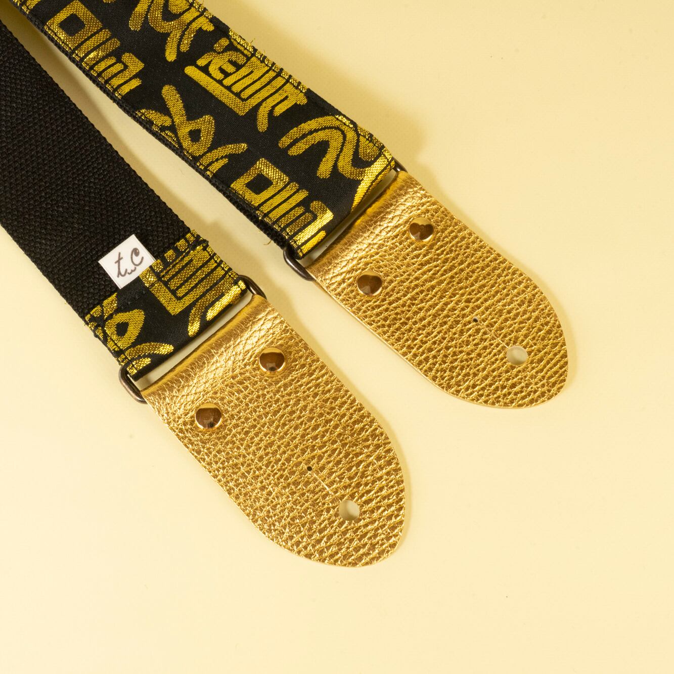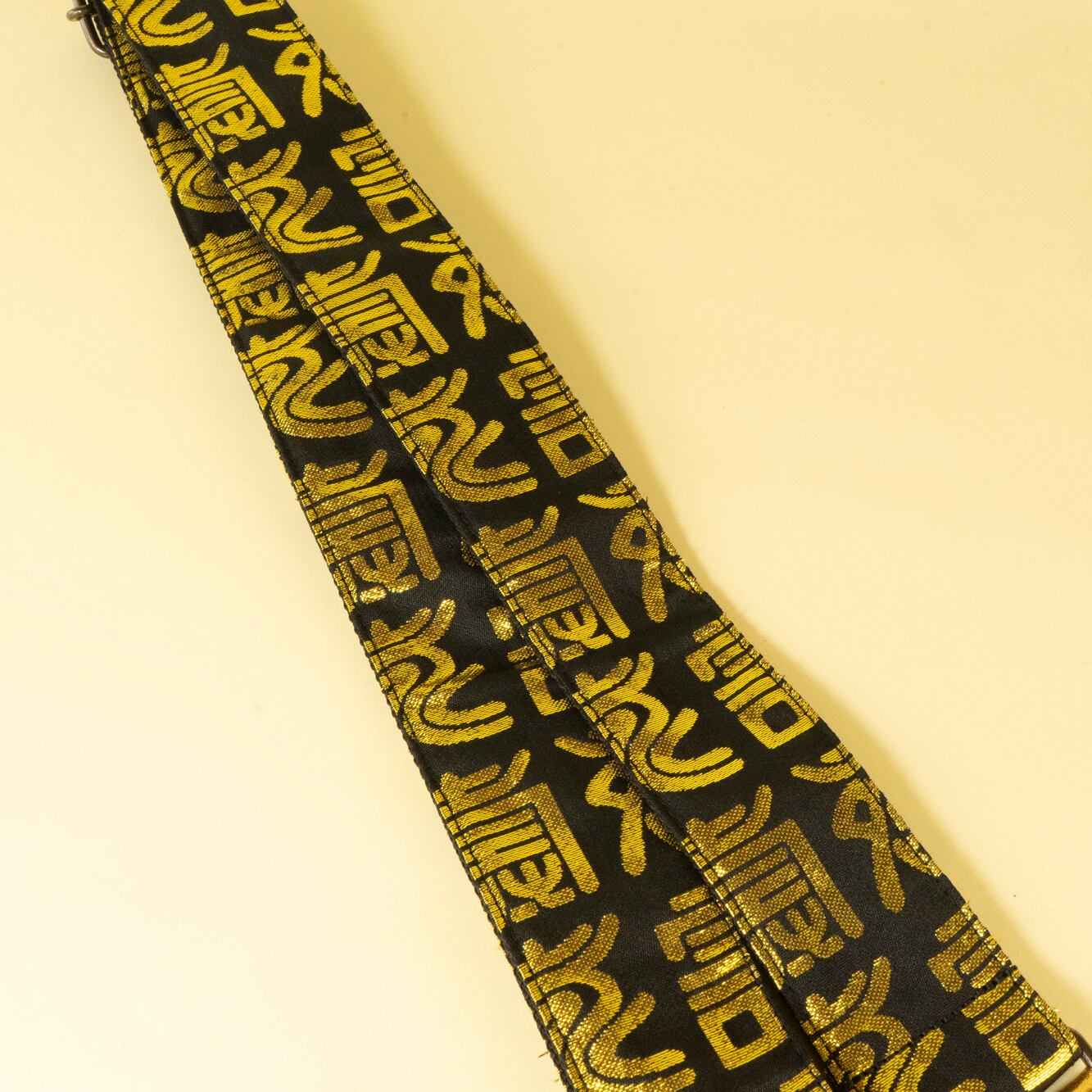 おめでたい「寿」の文字が延々と並ぶ黒×ゴールドの踊り帯を、同じく黒いポリプロピレンに縫い付け、ギラギラしたシボゴールドのストラップエンドを合わせて、潔いほどキンキラキンにド派手に仕上げました。